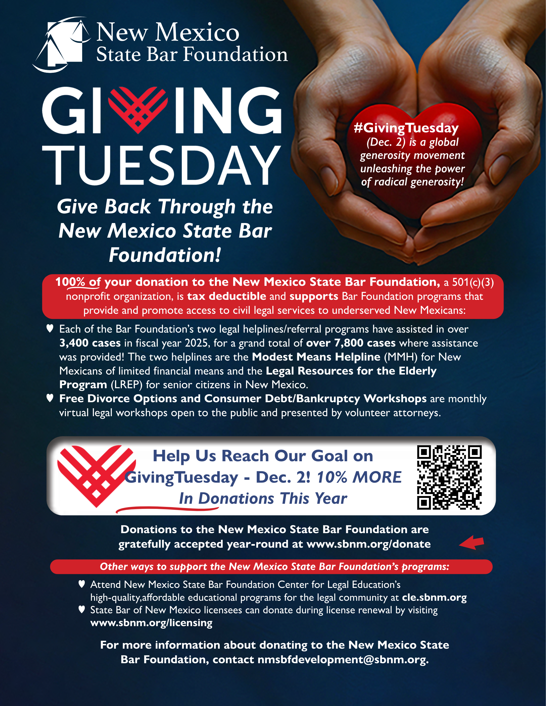 The public service and educational arm of the State Bar is the New Mexico State Bar Foundation which is a 501(c)(3) non-profit corporation established in 1991. Learn how the Bar Foundation assists the public and the services it provides. Contact sbnmaccounting@sbnm.org, to make a donation that will contribute to the continuation of important services.