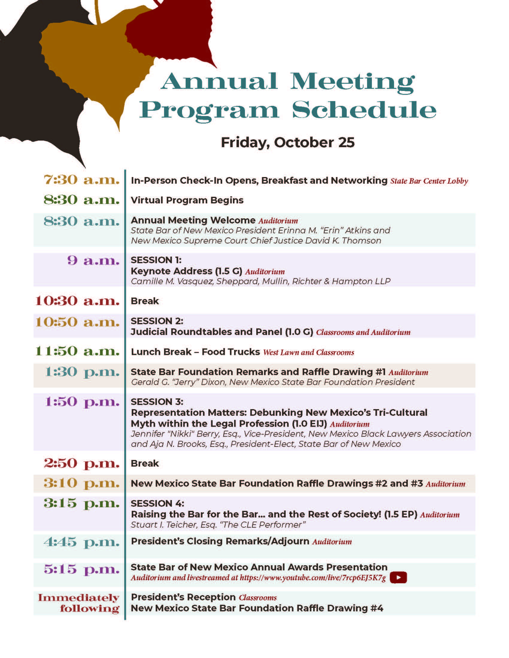 Several judges from different New Mexico courts will be interacting with Annual Meeting attendees, both in-person and virtually, on a variety of issues including content related to the 2024 Annual Meeting’s “Be Inspired” theme and interesting topics important to New Mexico’s judiciary. The judges will also answer questions pertaining to the interests of legal professionals in New Mexico.