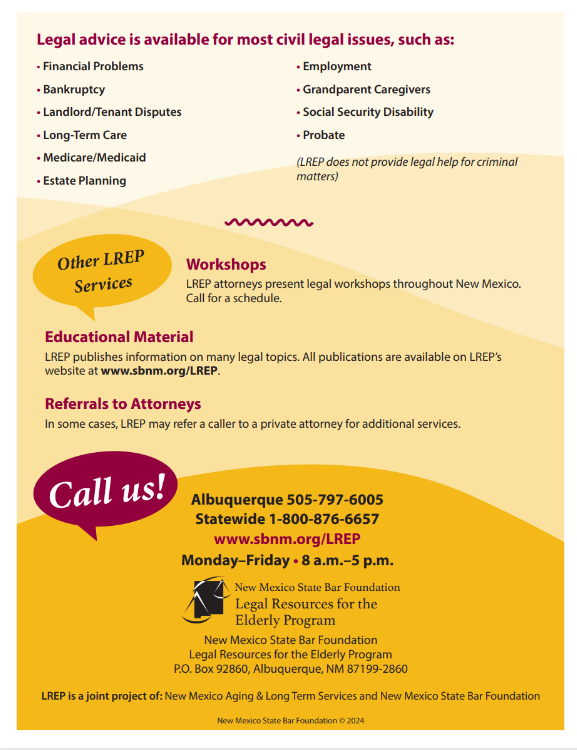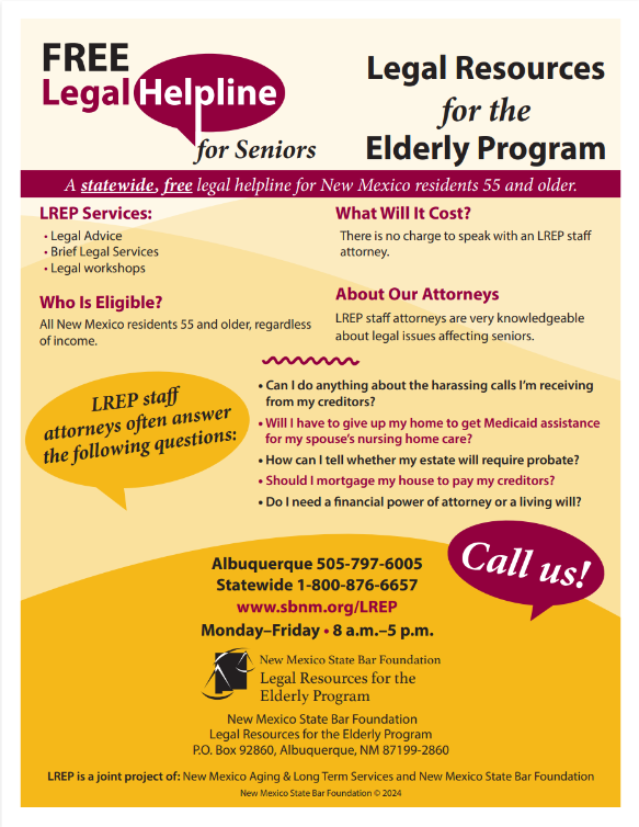 The Legal Resources for the Elderly Program (LREP) is a free, statewide helpline for New Mexico residents age 55 and older. The program does not have any income restrictions. LREP is a joint project of the New Mexico State Bar Foundation and the New Mexico Aging and Long-Term Services Department and has been in existence for more than 30 years.