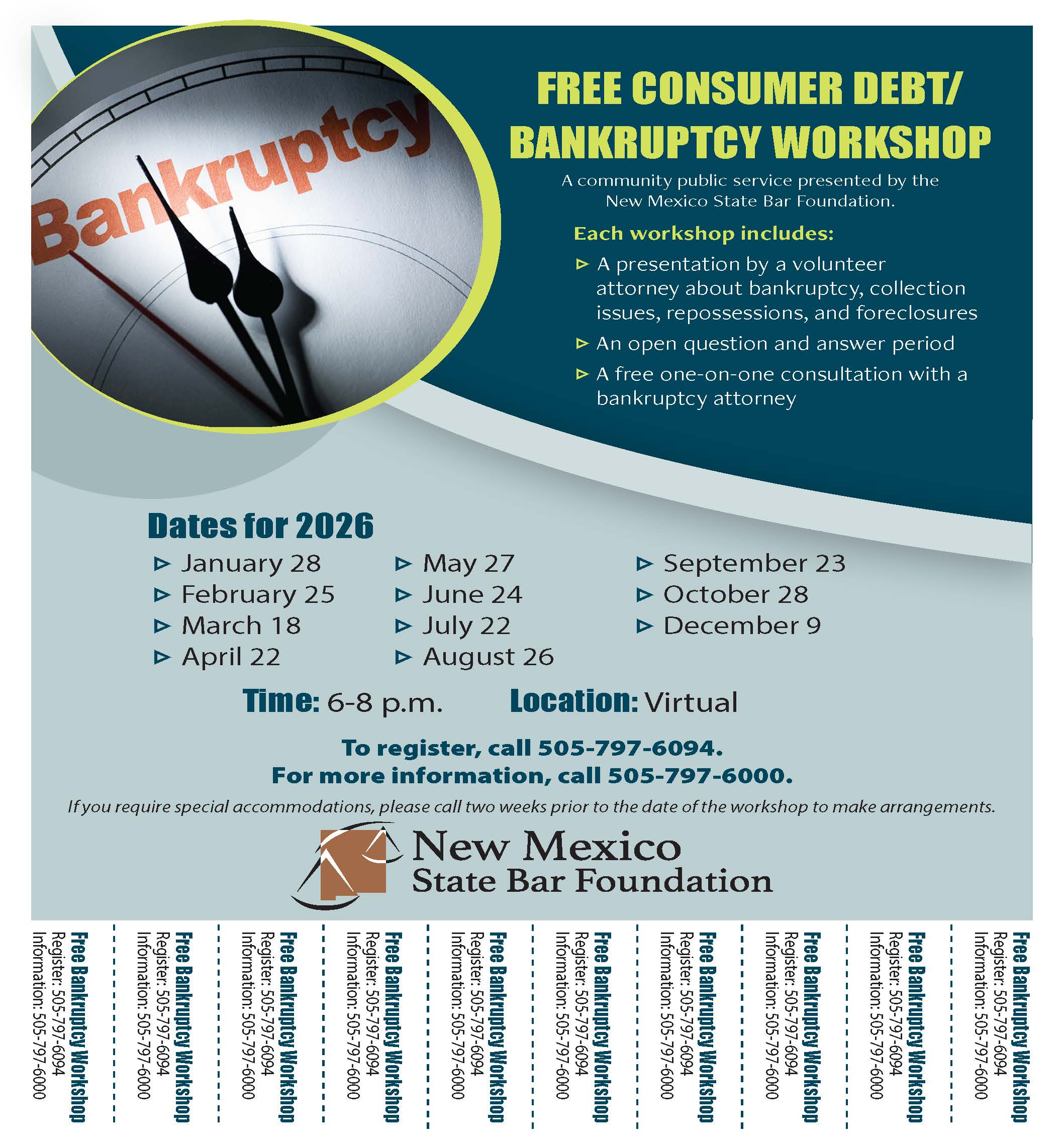 Get answers to questions about repossessions, foreclosures, collection issues, bankruptcy and more. The free presentation includes a presentation by a volunteer attorney, an open question and answer period and a one on one consultation with an attorney. The virtual workshops occur on the fourth Wednesday of each month (except November) at 6 p.m. To register please call (505) 797-6094. View/Print the Workshop Flyer