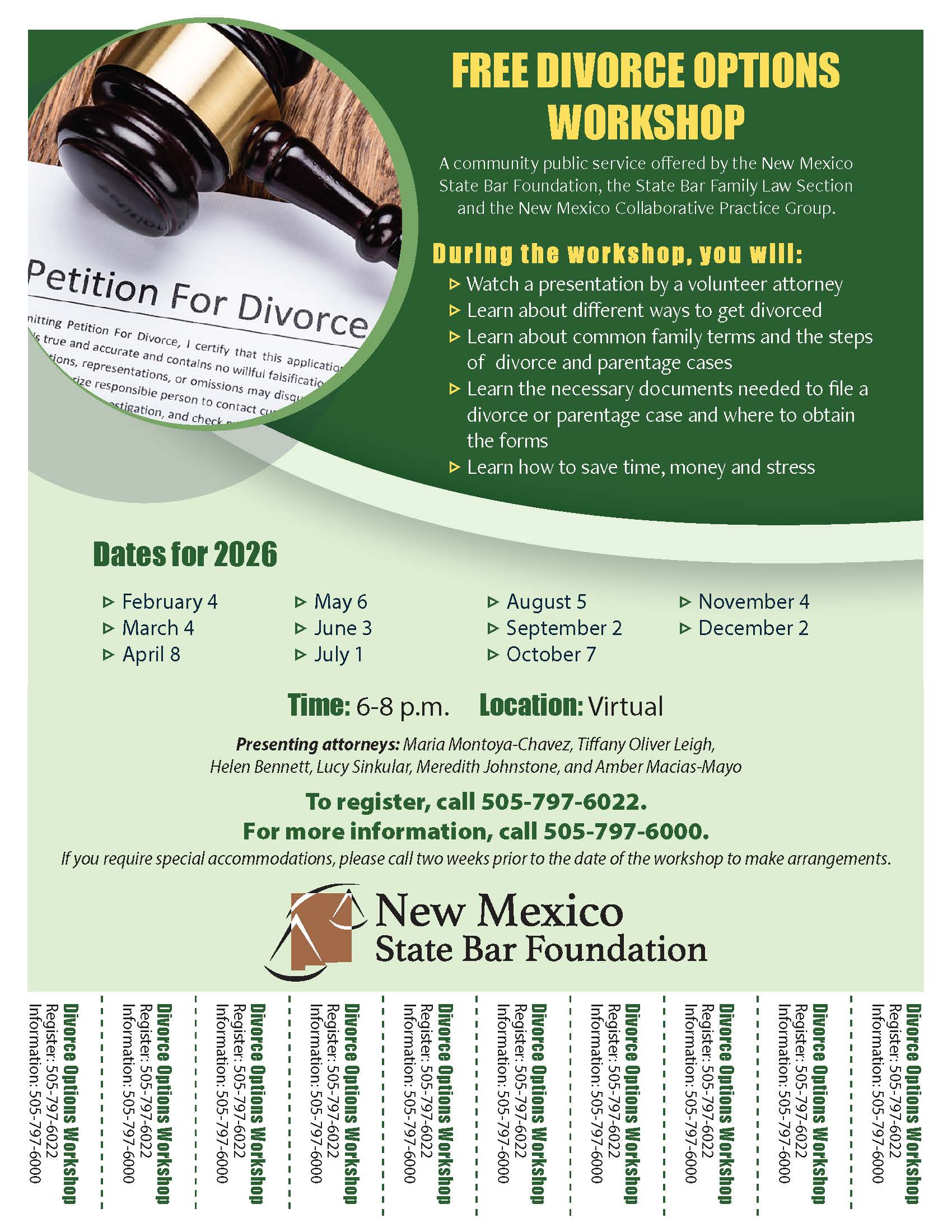 Attendees will learn how to save time, money and stress at a the State Bar's free Divorce Options Workshop. The virtual workshop includes a presentation by a volunteer attorney, materials on divorce and an open question-and-answer period. This virtual event is a free community service open to the public. Workshops are held (usually) on the first Wednesday of each month from 6-8 p.m. MT To register please call (505) 797-6022. View/Print the Workshop Flyer