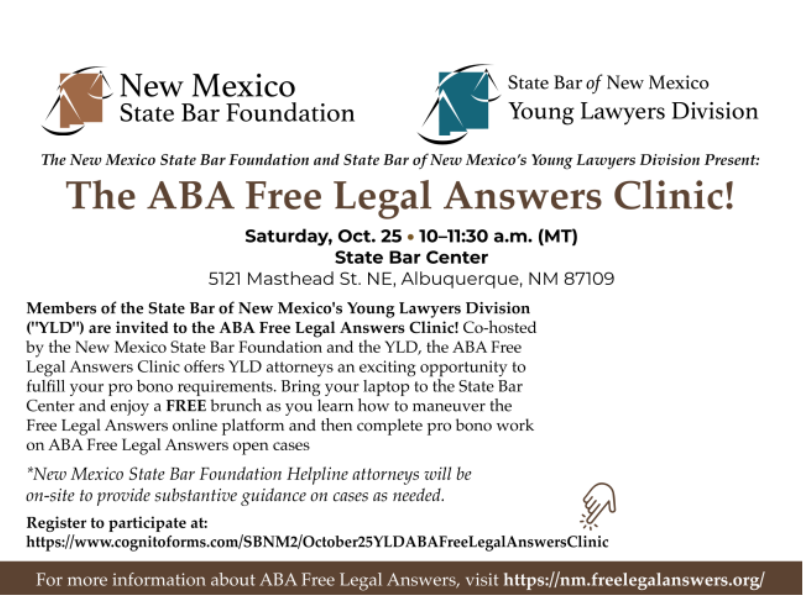 The New Mexico State Bar Foundation and the State Bar of New Mexico’s Young Lawyers Division will host the ABA Free Legal Answers Clinic on Saturday, Oct. 25, from 10 to 11:30 a.m. at the State Bar Center in Albuquerque. The clinic gives Young Lawyers Division members an opportunity to complete pro bono hours by assisting with ABA Free Legal Answers open cases. Participants are encouraged to bring a laptop and will receive free brunch while learning to navigate the online platform. State Bar Foundation Helpline attorneys will also be on site to provide substantive guidance as needed.