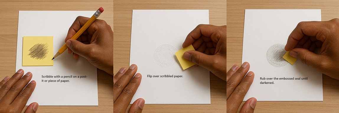 To darken an embossed seal - scribble on a post it or piece of paper with a pencil, and then rub across the seal until it is legible.